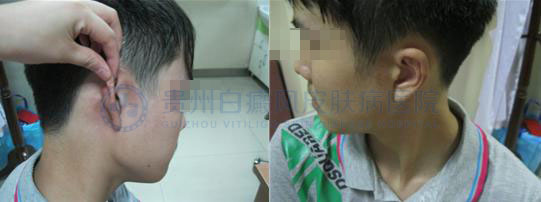 (针对患者病情,专家采用我院特色细胞复色疗法进行治疗,一个疗程时间后,白斑处大量产生黑色素,基底颜色加深,疗效显著)