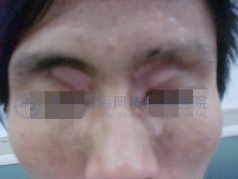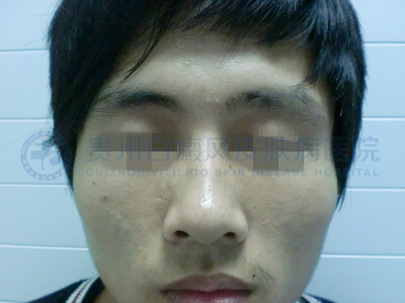 初诊时,患者面部白斑清晰可见,色素脱失较严重。