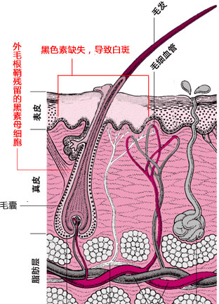 当患者受到精神压力、微量元素缺失、自身免疫异常、内分泌紊乱、暴晒、外伤等因素刺激后,体内黑色素细胞不能正常代谢合成黑色素,从而表现在皮肤上形成白癜风。所以,要治愈白癜风(白斑),必须检查出导致黑色素细胞出现异常的原因,从细胞治疗层面解决黑色素缺失难题。